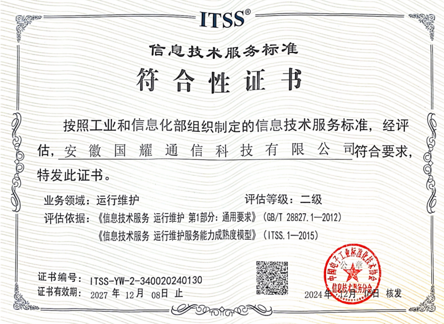 在當(dāng)今快速發(fā)展的信息技術(shù)時(shí)代,企業(yè)的運(yùn)維服務(wù)能力成為了衡量其技術(shù)實(shí)力和服務(wù)質(zhì)量的重要指標(biāo)。近日,安徽國(guó)耀通信科技有限公司憑借卓越的技術(shù)實(shí)力和專業(yè)的服務(wù)團(tuán)隊(duì),在工業(yè)和信息化部組織制定的信息技術(shù)服務(wù)標(biāo)準(zhǔn)(ITSS)評(píng)審中脫穎而出,成功獲得運(yùn)行維護(hù)服務(wù)二級(jí)資質(zhì)認(rèn)證。