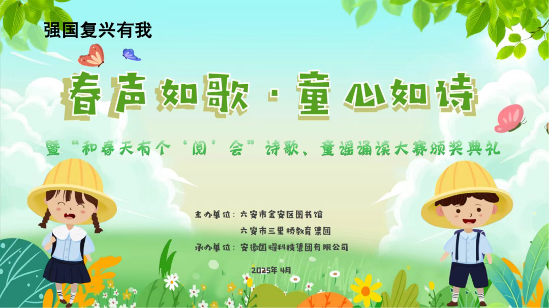 2025 年 4 月 12 日下午,“春聲如歌·童心如詩(shī)”暨“和春天有個(gè)‘閱’會(huì)”詩(shī)歌童謠誦讀大賽頒獎(jiǎng)典禮在六安市三里橋小學(xué)光明路校區(qū)報(bào)告廳圓滿(mǎn)舉行。